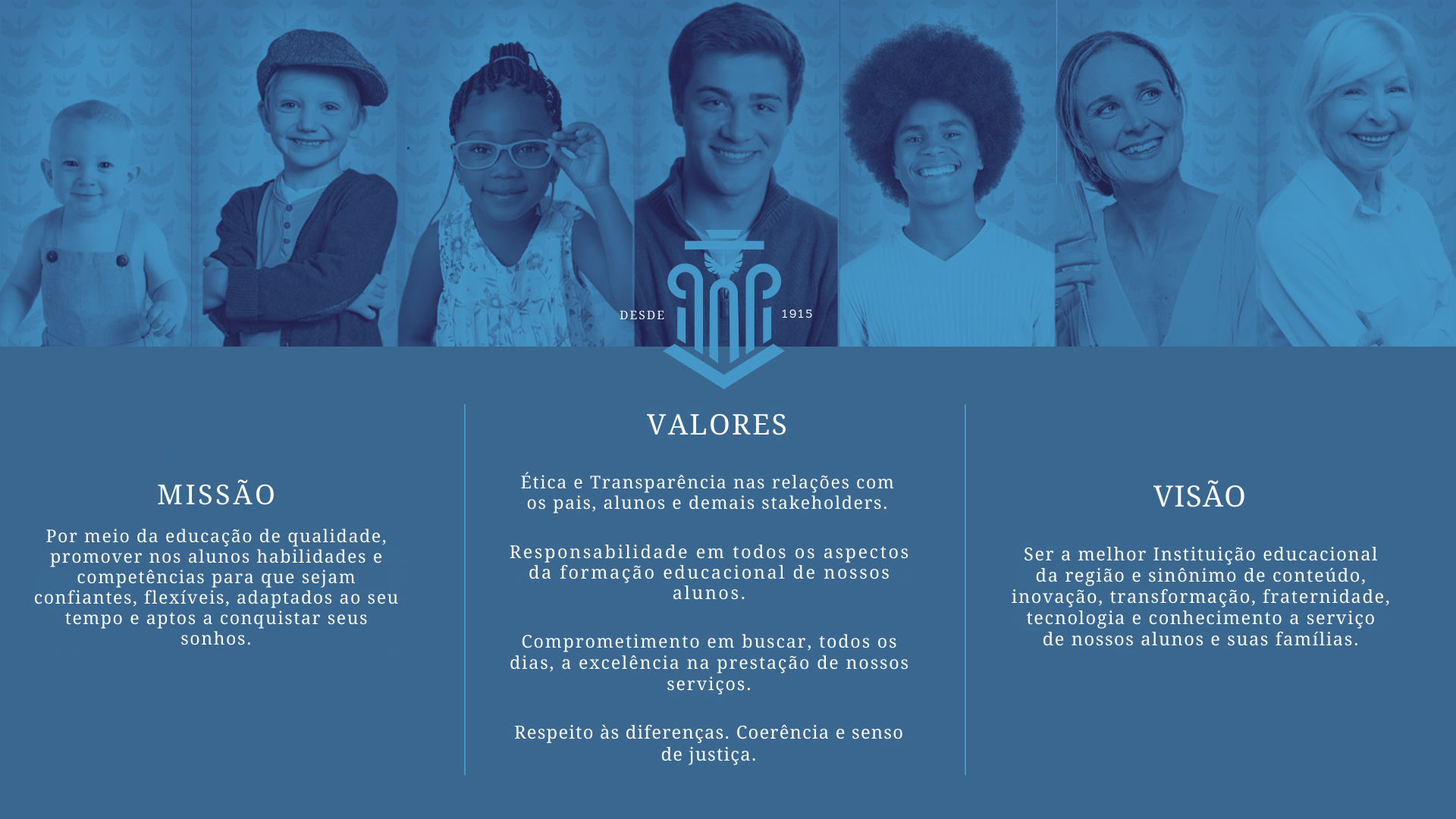 Ética e Transparência nas relações com os pais, alunos e demais stakeholders. Responsabilidade em todos os aspectos da formação educacional de nossos alunos. Comprometimento em buscar, todos os dias, a excelência na prestação de nossos serviços. Respeito às diferenças. Coerência e senso de justiça.